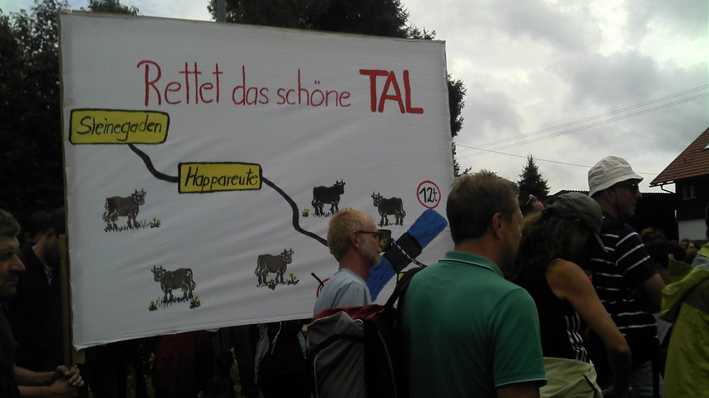 Mit geschätzten 200 Teilnehmern wurde am Sonntag den 29. Juli 2012 ein eindrucksvoller Beweis gegeben dass eine breite Mehrheit der Bürger gegen den Ausbau der Verbindungsstraße Eglofstal Steinegaden ist.