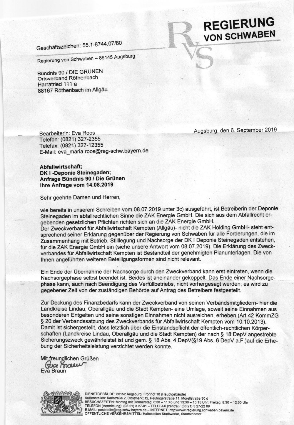 Deponie Steinegaden: Antwort der Regierung von Schwaben
