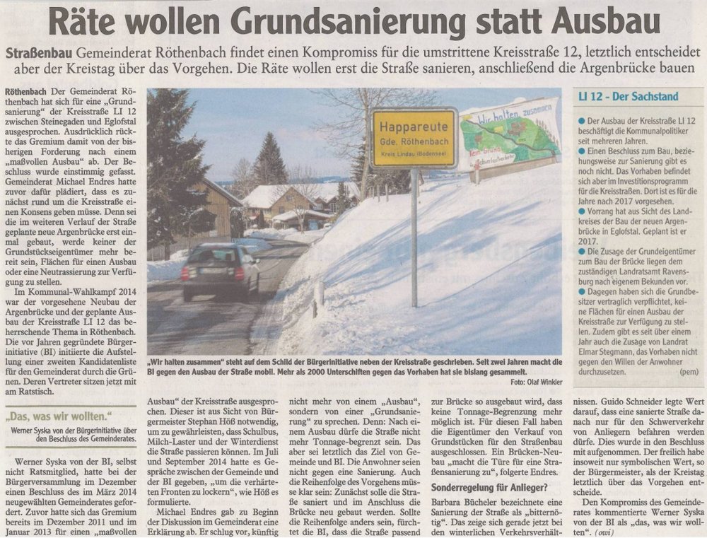 Der Gemeinderat Röthenbach (Westallgäu) hat sich für eine “Grundsanierung” der Kreisstraße LI12 zwischen Steinegaden und Eglofstal ausgesprochen. Ausdrücklich rückte das Gremium damit von der bisherigen Forderung nach einem “maßvollen Ausbau” ab. Der Beschluss wurde einstimmig gefasst.