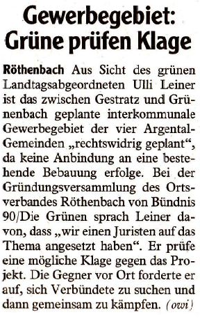 Aus Sicht des grünen Landtagsabgeordneten Ulli Leiner ist das zwischen Gestratz und Grünenbach geplante interkommunale Gewerbegebiet der vier Argentalgemeinden “rechtswidrig geplant”, da keine Anbindung an eine bestehende Bebauung erfolgt.