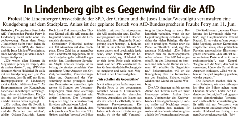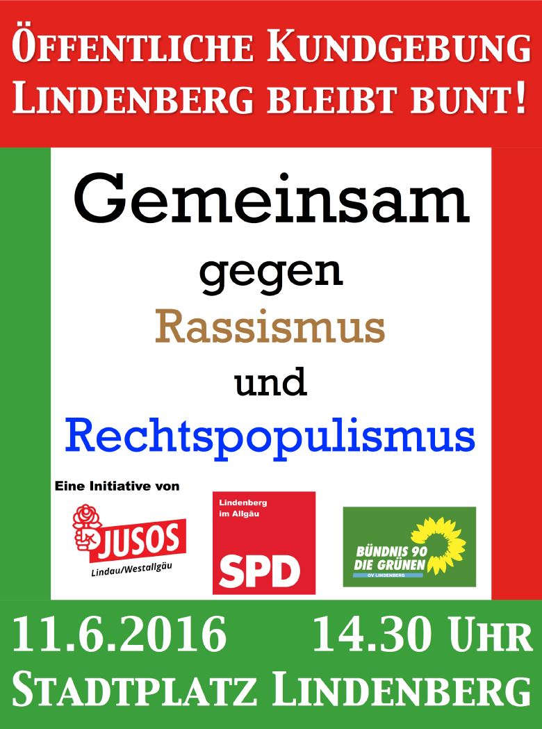 Kommt alle und zeigt, daß Lindenberg und der ganze Landkreis Lindau sich zu einer bunten, weltoffenen Politik ohne Hass und Hetze bekennen!