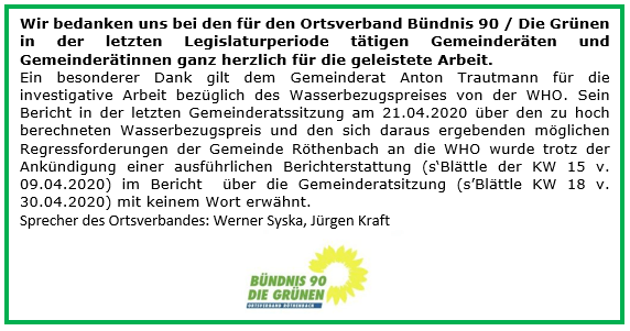 Ein besonderer Dank gilt dem Gemeinderat Anton Trautmann für die investigative Arbeit bezüglich des Wasserbezugspreises von der WHO. Sein Bericht in der letzten Gemeinderatssitzung am 21.04.2020 über den zu hoch berechneten Wasserbezugspreis und den sich daraus ergebenden möglichen Regressforderungen der Gemeinde Röthenbach an die WHO wurde trotz der Ankündigung einer ausführlichen Berichterstattung (s‘Blättle der KW 15 v. 09.04.2020) im Bericht über die Gemeinderatsitzung (s’Blättle KW 18 v. 30.04.2020) mit keinem Wort erwähnt.