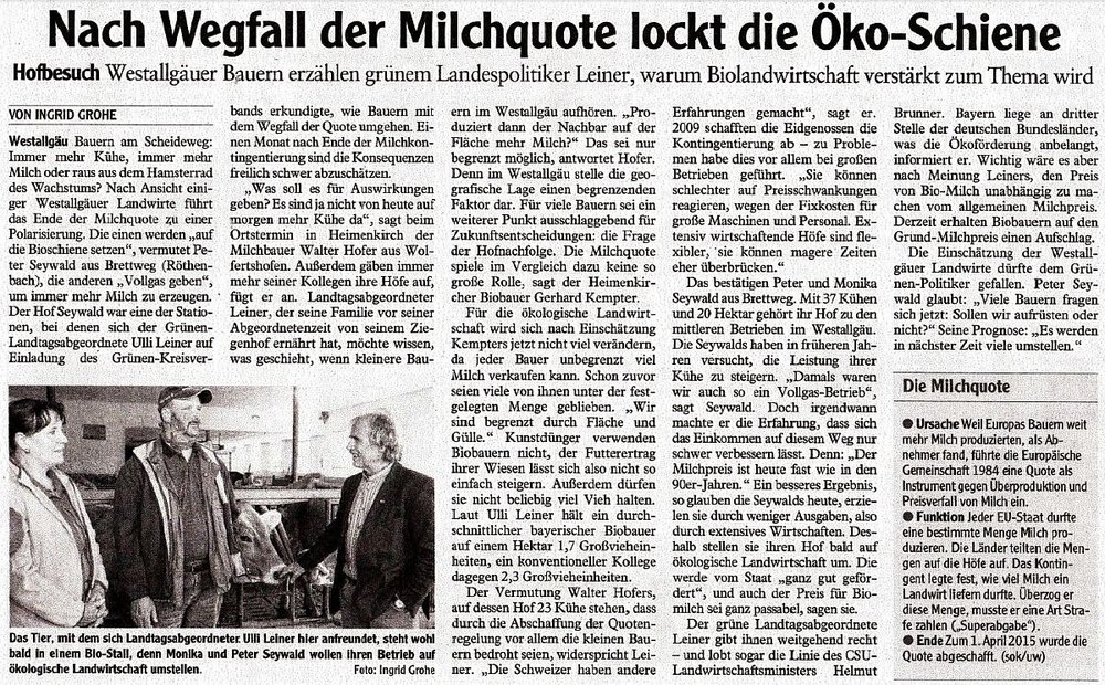 Zusammen mit unserem Landtagsabgeordneten Ulli Leiner haben wir Landwirte im Landkreis besucht und mit ihnen über das Thema “Wegfall der Milchquote” gesprochen.