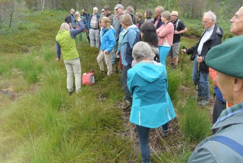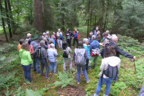 Zunächst ging es um die Plenterwälder, die durch die kleinräumige Bewirtschaftung mit unterschiedlichen Baumarten, Wuchshöhen und -stärken eine ökologisch vielfältige Bewirtschaftungsform darstellen und damit für den Klimawandel gut gewappnet sind. In den Trogener Mooren erwartete die Gruppe eine wiedererstehende Hochmoorlandschaft, die sich ganz langsam (ca. 1 mm pro Jahr) wieder aufbaut und in vielerlei Hinsicht sehr wertvoll ist. Wurde diese Gegend über lange Zeit zum Torfabbau genutzt, so wird sie nun durch die Zusammenarbeit von BUND und Landschaftspflegeverband und mit Unterstützung durch verschiedene Förderformen mit großem Engagement renaturiert. Die damit schon lange betraute Isolde Miller konnte das der Gruppe anhand der noch sichtbaren Maßnahmen mit Stauwerken eindrucksvoll verdeutlichen. Trocken gelegte Moore haben einen erschreckend hohen Anteil an CO2-Emisssionen. Intakte Moore hingegen haben trotz ihrer insgesamt bescheidenen Gesamtfläche auf der Welt eine enorme Kapazität zur Wasser- und CO2-Speicherung und bilden ein wichtiges Habitat für die Artenvielfalt.