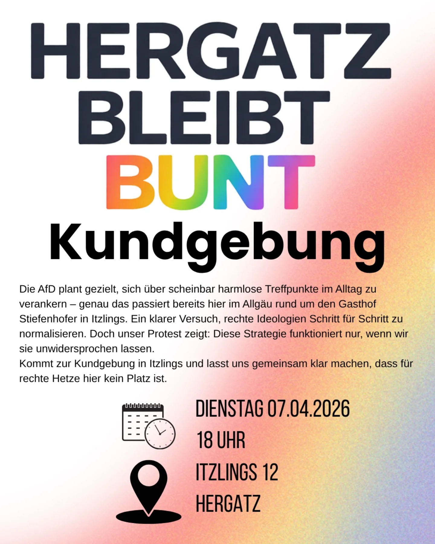 Die AfD plant gezielt, sich über scheinbar harmlose Treffpunkte im Alltag zu verankern – genau das passiert bereits hier im Allgäu rund um den Gasthof Stiefenhofer in Itzlings. Ein klarer Versuch, rechte Ideologien Schritt für Schritt zu normalisieren. Doch unser Protest zeigt: Diese Strategie funktioniert nur, wenn wir sie unwidersprochen lassen.